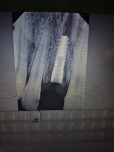 Step 1 — Implant Placement The titanium implant fixture was surgically placed into the healed bone site with precision. The post-placement X-ray confirms ideal positioning — the implant is perfectly seated within the bone, in correct angulation and depth, with healthy bone visible on all sides.